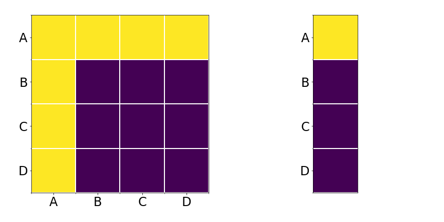 An example adjacency matrix for 4 nodes. Each element in this matrix encodes the edge strength between two nodes. There are no self edges (e.g., the edge between node A to itself has a strength of zero), and the matrix is symmetric (e.g., element i,j is the same as element j,i).